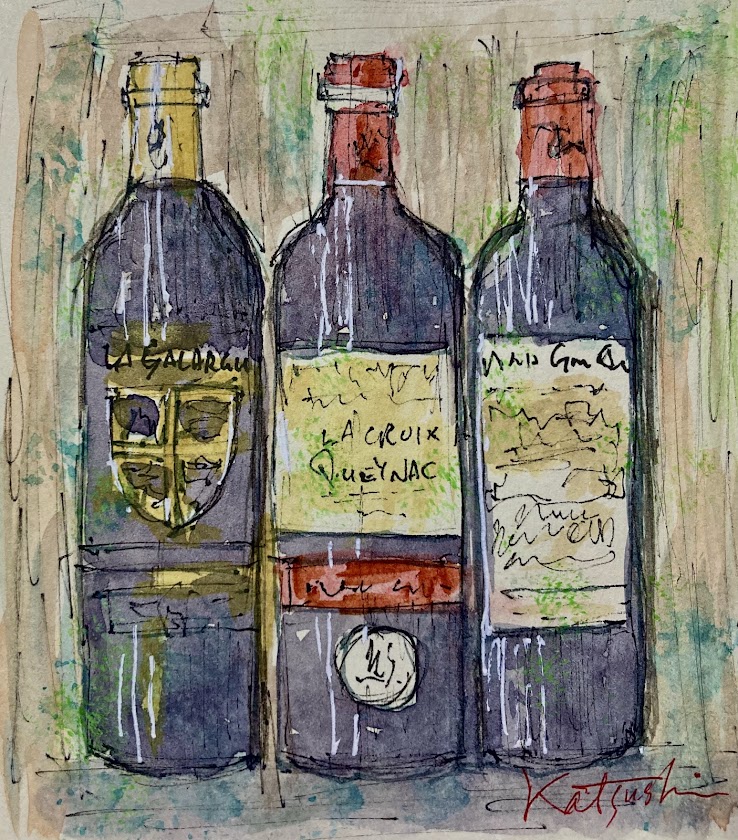 悠長に構えているわけではないが、稀に隙間の時間ができる。文を綴らない時は鉛筆画を描く。その前に画題を探す。イタリアの鐘楼や天満橋の夜景などスマホの写真を見る。夕食のワカサギの素揚げやワインのDMも候補に上がる。3本のワインボトルを選んだ。