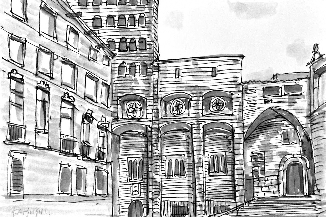 濃淡や陰影の仕上げがよく出来ているので驚いた。基本はぼくのスケッチの線を生かしながら、バーントシェンナとバーントアンバーの2色を基調にして左手の建物の窓枠を造作している。少し赤みがかった空色も建物の色と合っている。