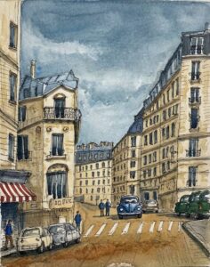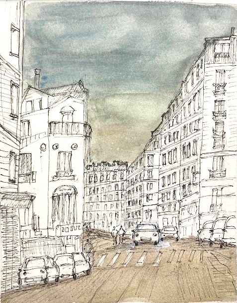 ならばとばかりに、もうひとつお願いすることにした。パリはモンマルトルで撮った写真を元にしてスケッチした1枚。空と通りに軽く色をつけたままで放っておいた絵。
