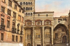 どこの街だったか思い出せないが、イタリア旅行中にスケッチした1枚の絵が残っている。この単色のペン画を示して「この絵を着色して」とAIに指示した。それ以外は、建築様式も時代も希望の色も一切情報を提供していない。30秒もしないうちにAIはリマスターしてみせた。それがこの絵だ。