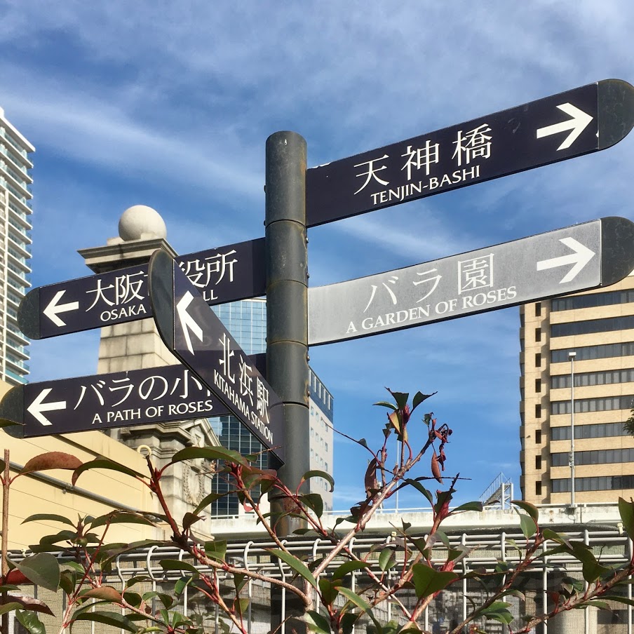 標識の書体の定番はゴシック体だ。指示に適している。先日、中之島を歩いていた。勝手知ったるエリアだから迷うことはない。じっくり標識を眺めることはなかった。なにげなく飛行機雲を見上げたら標識も目に入った。大阪市役所、バラの小径、北浜駅、天神橋、バラ園の文字。すべて明朝体である。いつから明朝体を使っていたのだろうか。