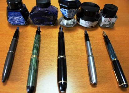 あれこれと悩んだ挙句、万年筆とインクの「パートナーシップ」を決めた(写真、左から順に一本目、二本目……)。