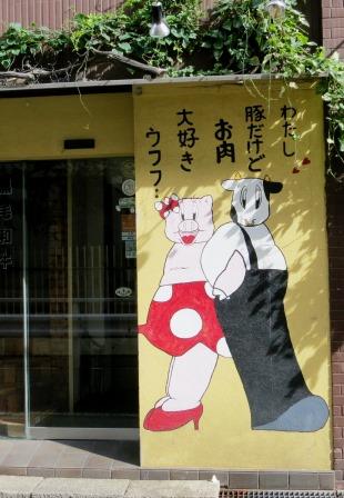 「わたし豚だけど お肉大好き ウフフ」と豚キャラ女子が牛キャラ男子に言っている。大阪ミナミのとある焼肉店の大きな看板。これが「肉と言えば牛肉」の何よりの証拠である。西日本とひとくくりにする自信がないので、関西、いや、もっと正確を期して大阪ということにしよう。肉うどん、肉じゃが、焼肉、串カツ、すき焼き、しゃぶしゃぶは、わざわざ断わるまでもなく、使う材料は牛肉に決まっている。串カツ屋で「串3本」と注文すれば、牛串のこと。肉を豚にしたければ、豚しゃぶとかとんカツと指名する。東日本――これも自信がないので、経験や知り合いの証言もある関東に限れば――「肉≒牛肉」という一致はほとんどないはずだ。