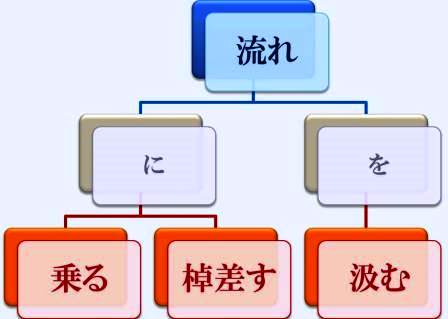 「流れ」という語のコロケーション構造を図示してみた。助詞を「に」と「を」に限れば、ぴったりくる動詞はおおむね三つ。もちろん、「流れに沿う」もありだし「流れが向いてきた」もありだろう。創意工夫の余地がないわけではない。これぞという新しいコロケーションが人口に膾炙すれば慣用化されることになる。ことばはそのようにして生き残り定番となってきた。但し、先に書いたように、語呂の良さとこなれは重要な条件である。