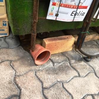 見た目がとにかく危なっかしい。植木鉢の横に頑丈なレンガが置きっぱなしになっているが、レンガではアジャストできなかった証拠だと見受ける。そこで、地面と棒の端の間に収まるものをあれこれと試した挙句、どうやら植木鉢を横倒しにしたらしっくりきたようだ。